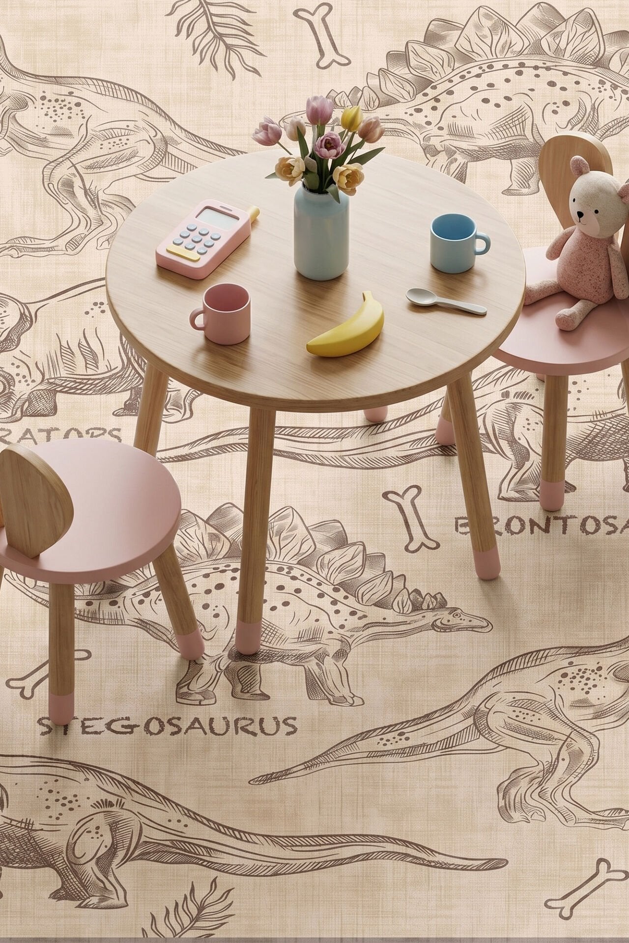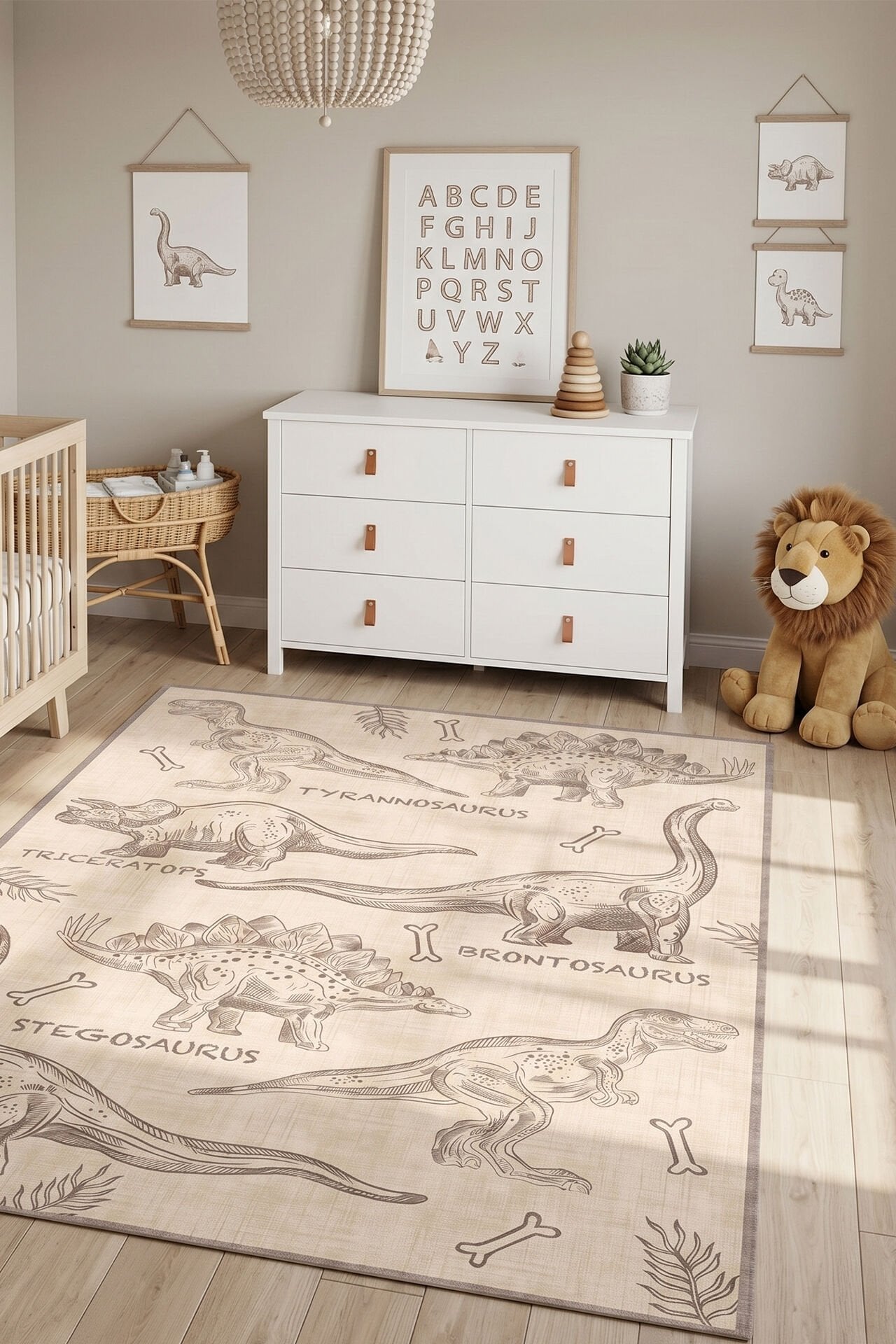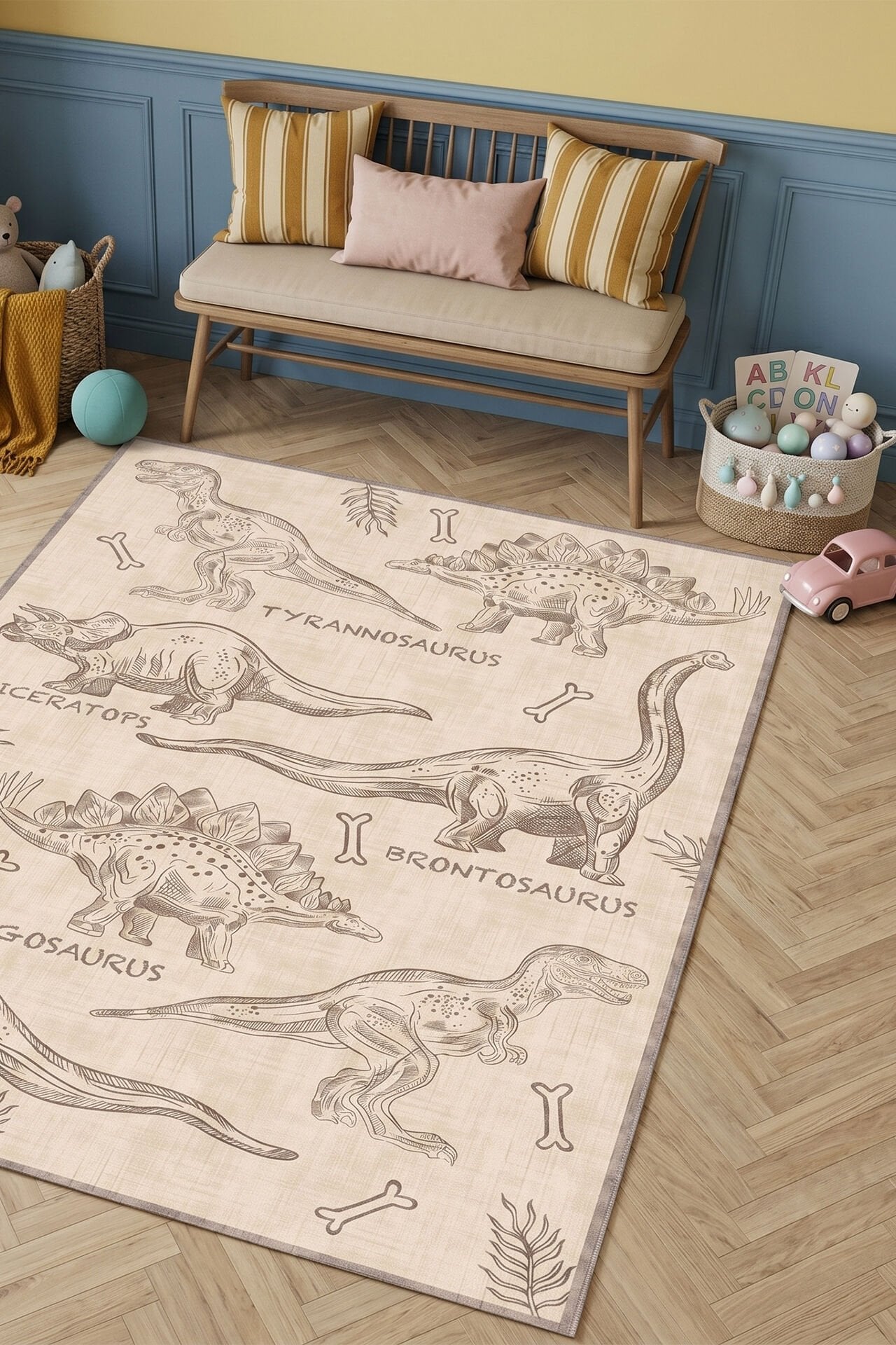 Daxon Dinozor Yıkanabilir Bambu Çocuk Odası Halısı - Bej