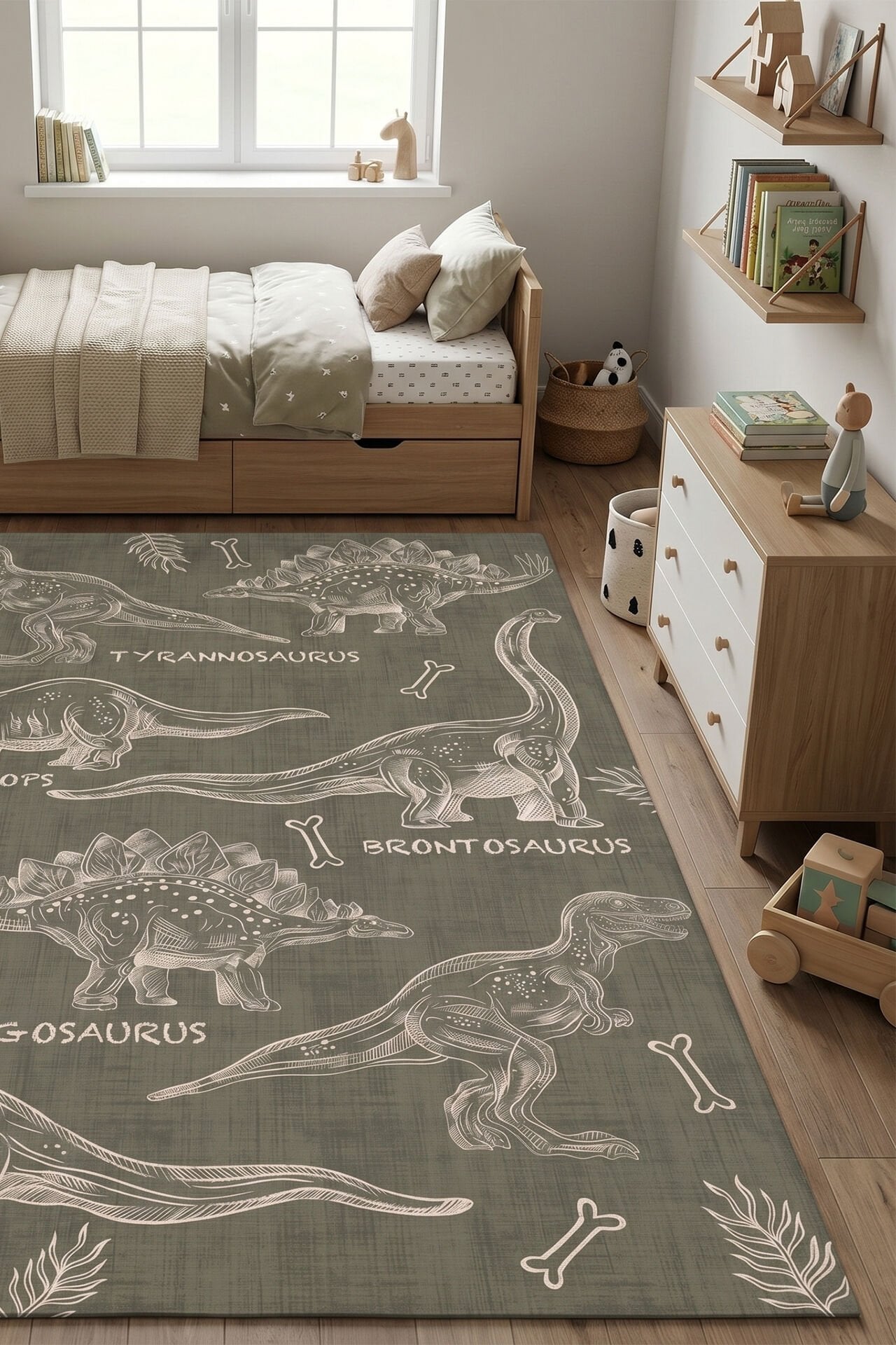 Daxon Yeşil Dinozor Halısı ile tarih öncesi harikalar dünyasına dalın. Sakinleştirici adaçayı tonlarında ve tebeşir beyazı çizimlerle tasarlanan bu halı, Stegosaurus, Tyrannosaurus, Brontosaurus ve Triceratops gibi sevilen dinozorları bir araya getirerek, doğal stile düşkün küçük dinozor severler için mükemmel bir seçimdir. Renkler cihaza ve ışıklandırmaya göre değişiklik gösterebilir.