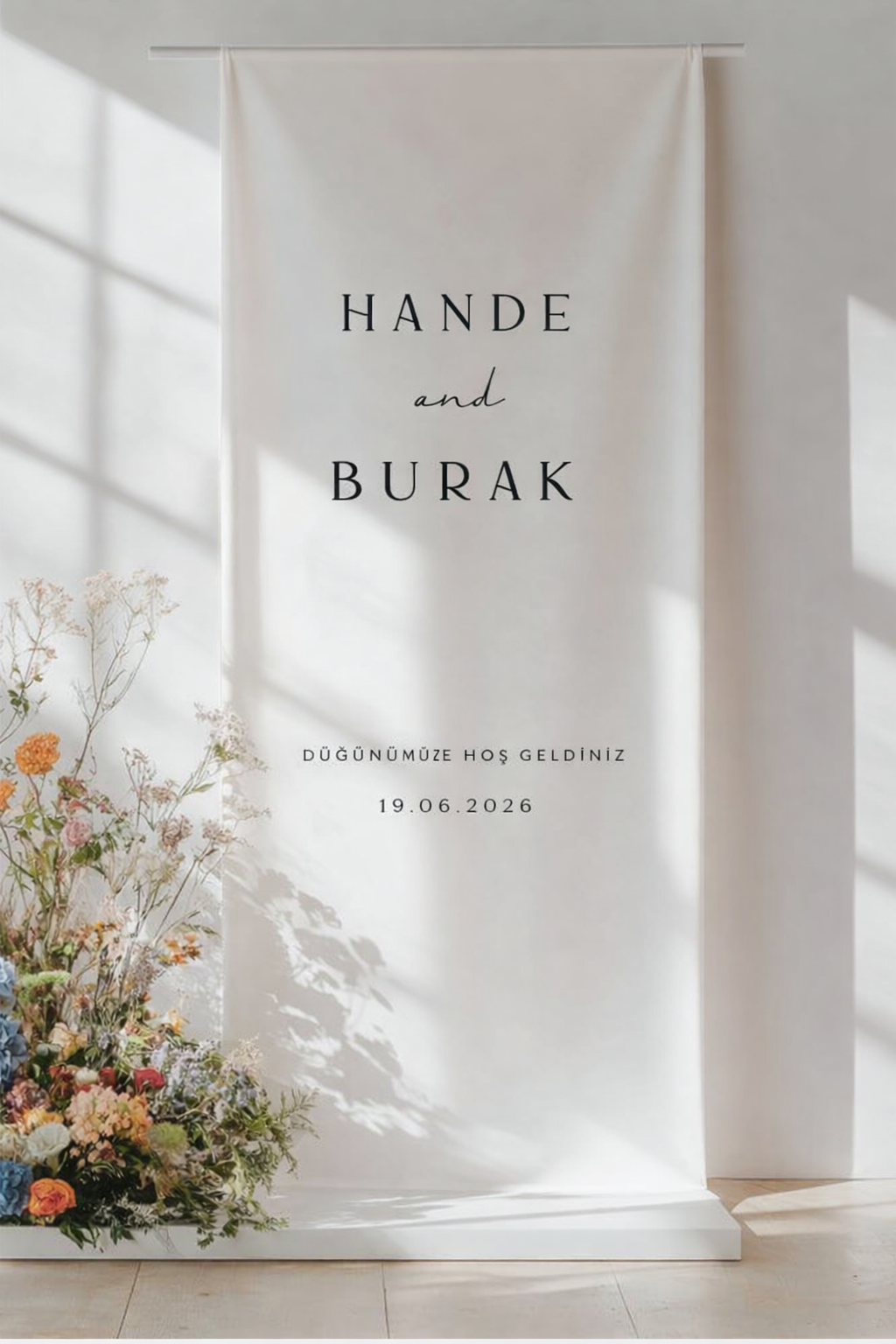 Minimal ve modern tasarımıyla öne çıkan bu kumaş karşılama panosu, düğün konseptinize şık ve zamansız bir dokunuş katar.