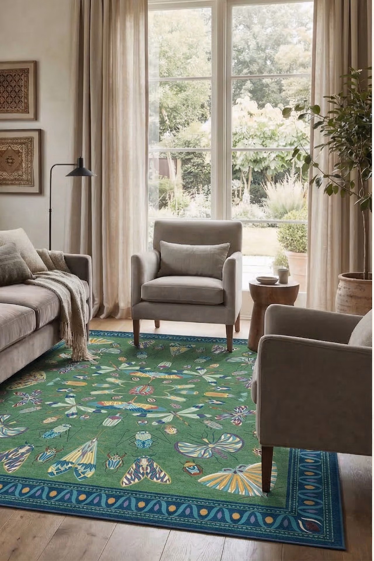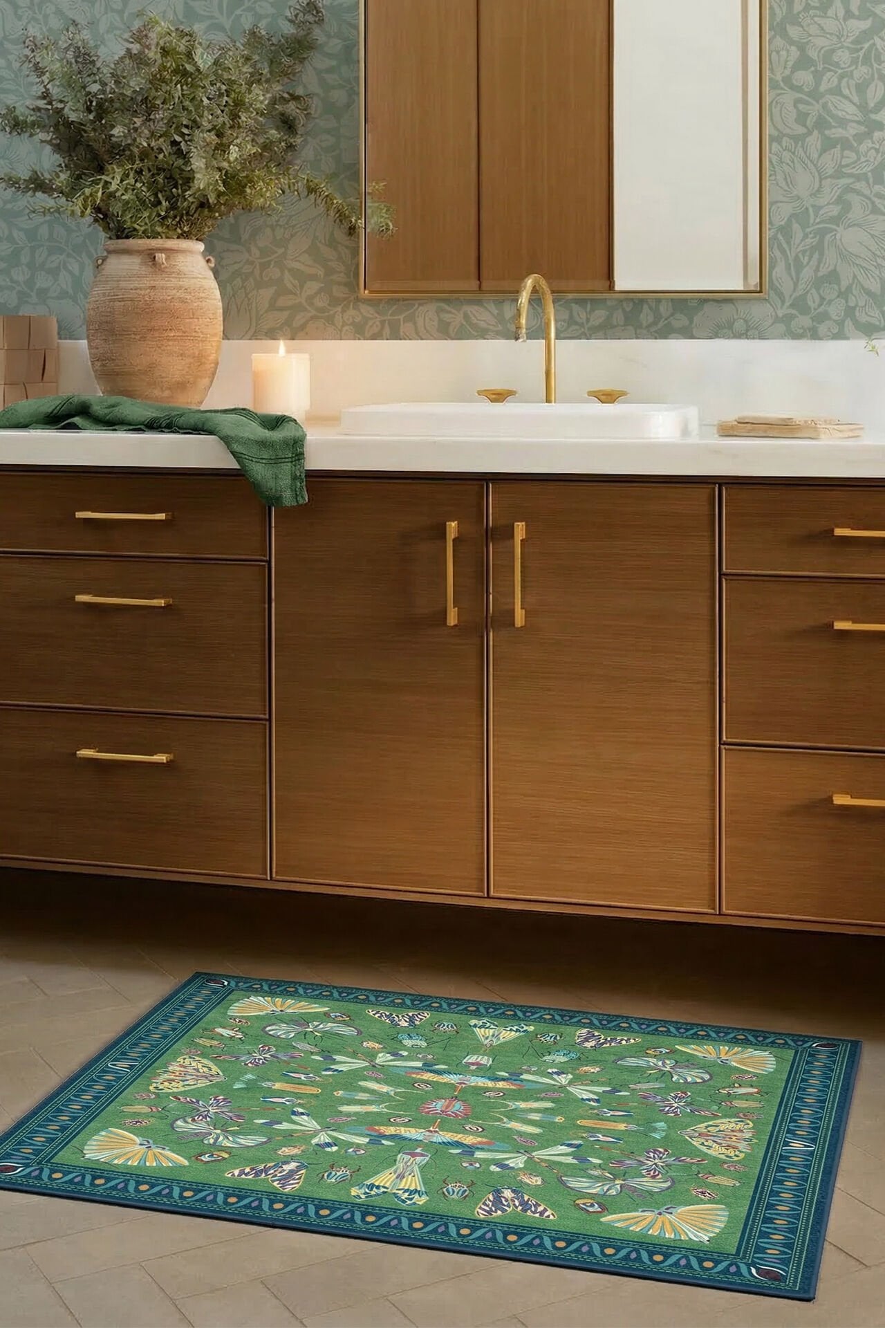 Renkli Kelebekler Yıkanabilir Dokuma Taban Bambu Halı Mavi Yeşil-RUG005