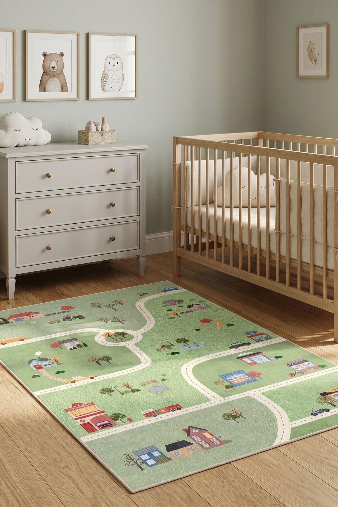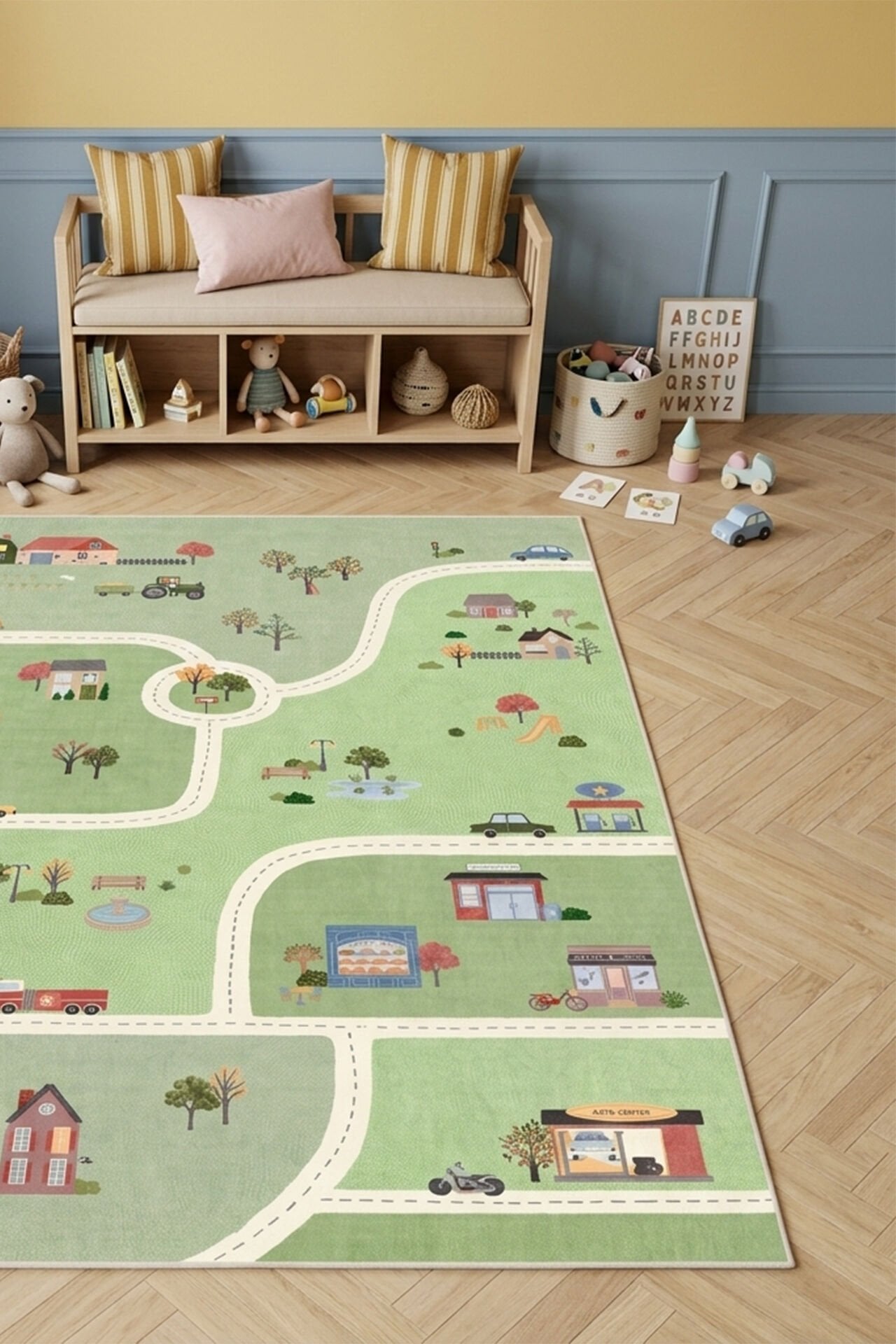 Road Yeşil Makinede Yıkanabilir Bambu Çocuk Odası Halısı